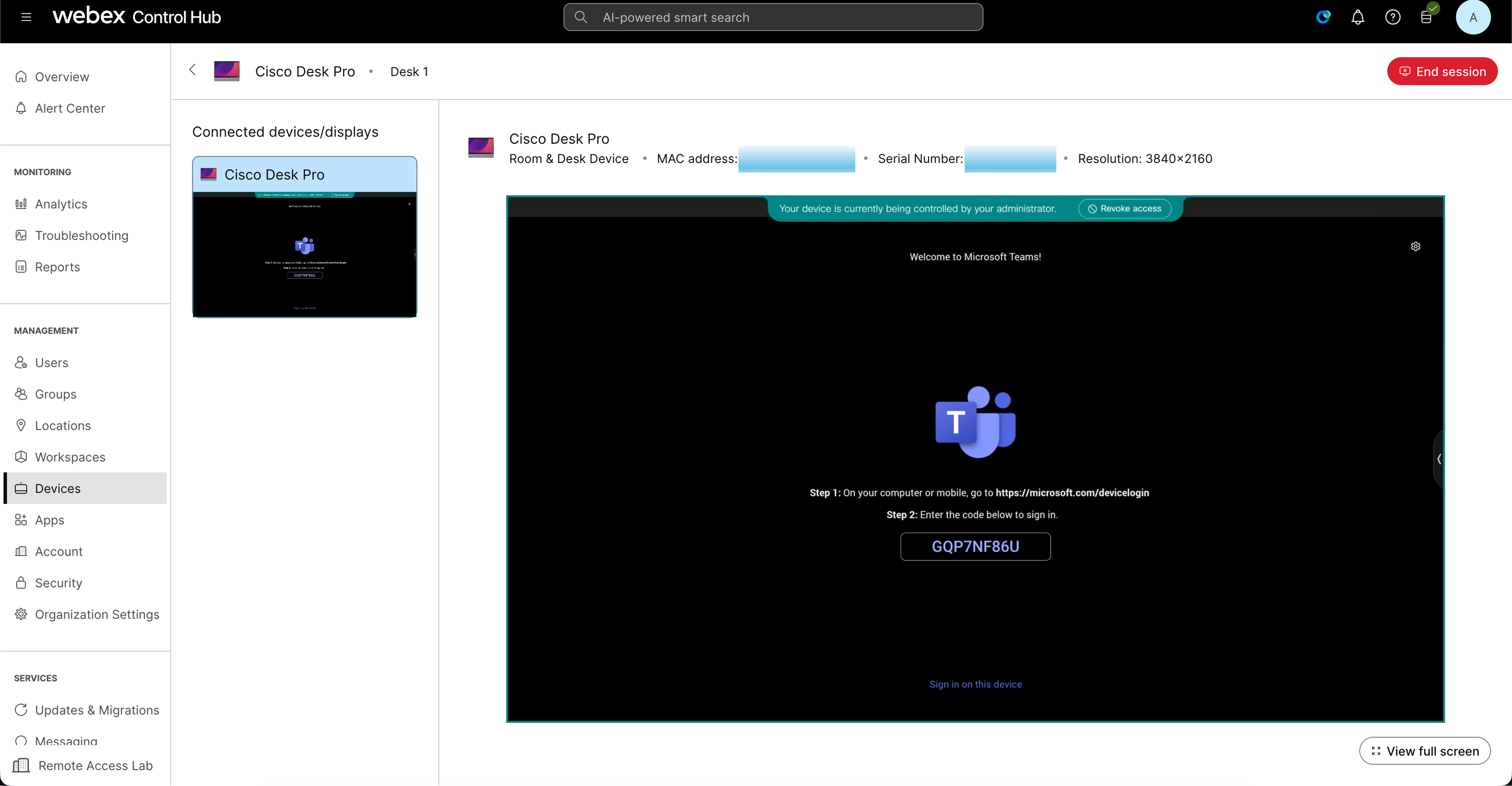 In this scenario, you will be an admin that needs to get the Microsoft Teams Room (MTR) code that shows on the device to be able to finish the MTR onboarding process. The device still needs to be registered to control hub so we can start a Remote Access session. Your goal is to view the MTR code on Remote Access session. We will not go further with the MTR registration. Once you reach this screen you are done with this scenario: