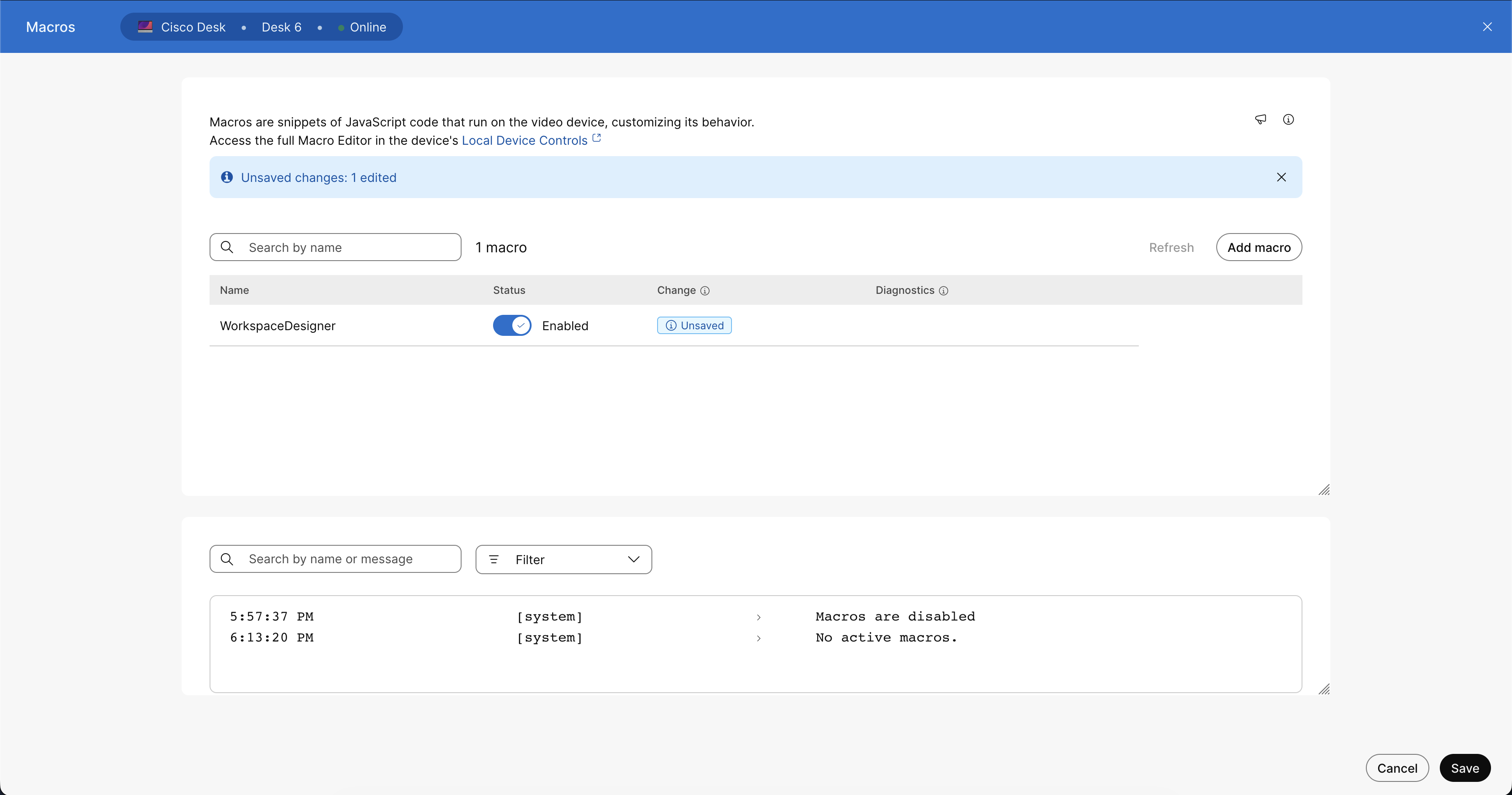 Here is the Macros page in Control Hub where you should ensure the LaunchWorkspaceDesigner.js macro is toggled on in Control Hub → Macros tab, then click Save: