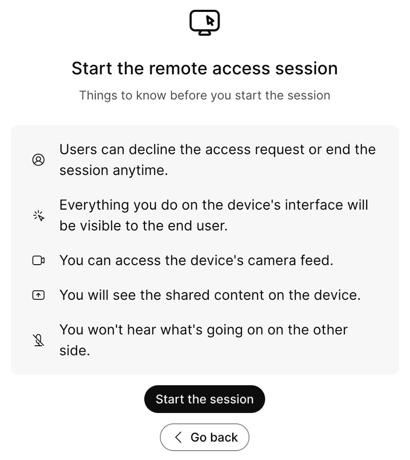 Once you click "Start the session" the device will display a popup message along with a sound cue letting any user present know the a Remote Access session is about to start. After 20 seconds, the session will start and you will have control over the device from Control Hub.