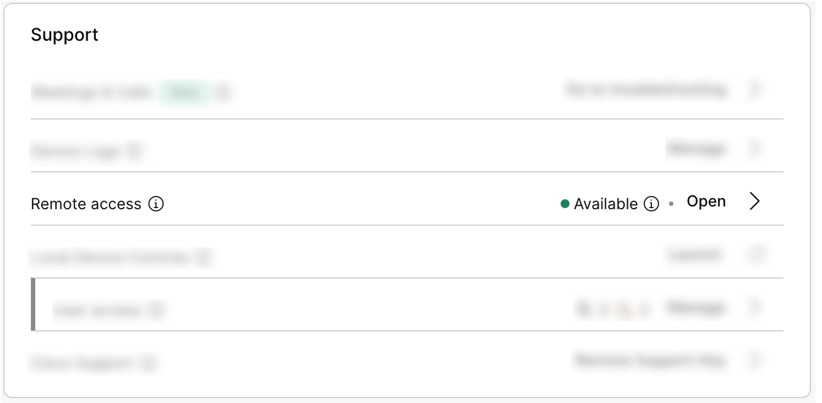 Once that is done log in to Control Hub, on the devices tab search for your device and open it. You will open the device's page in control hub where you have a lot of information and extensive control over the device. What interests us is the Remote Access feature in the support card as seen in the image below: