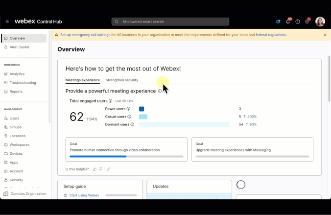 Now that we've configured Webex Suite settings, groups, locations, and users, let's explore how to stay informed and proactive by using alerts and analytics.