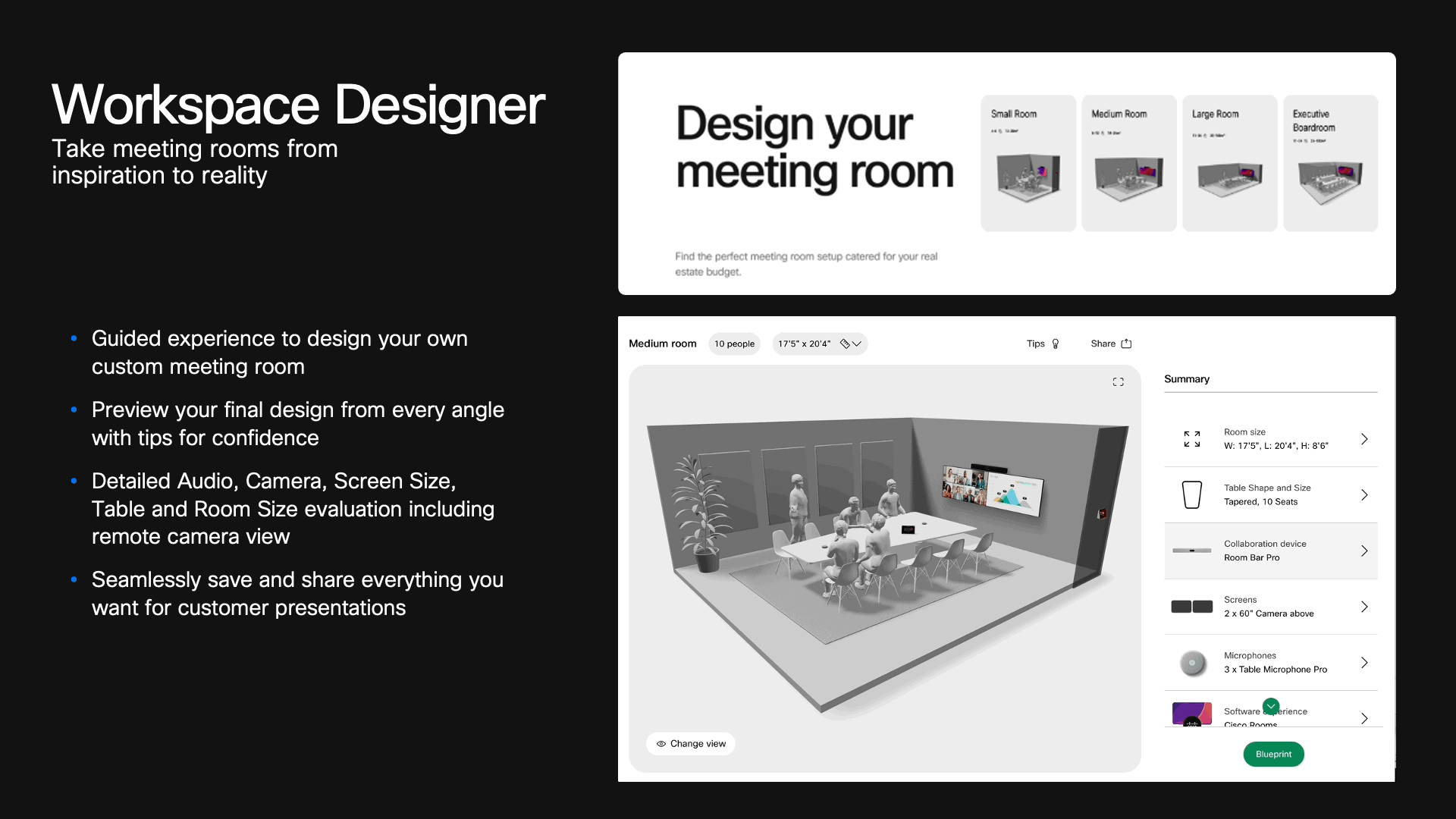 Cisco Workspace Designer is a free, web-based tool that helps organizations design and deploy video-enabled hybrid workspaces efficiently. It provides customizable room blueprints and a 3D configurator to take meeting rooms from inspiration to reality. |