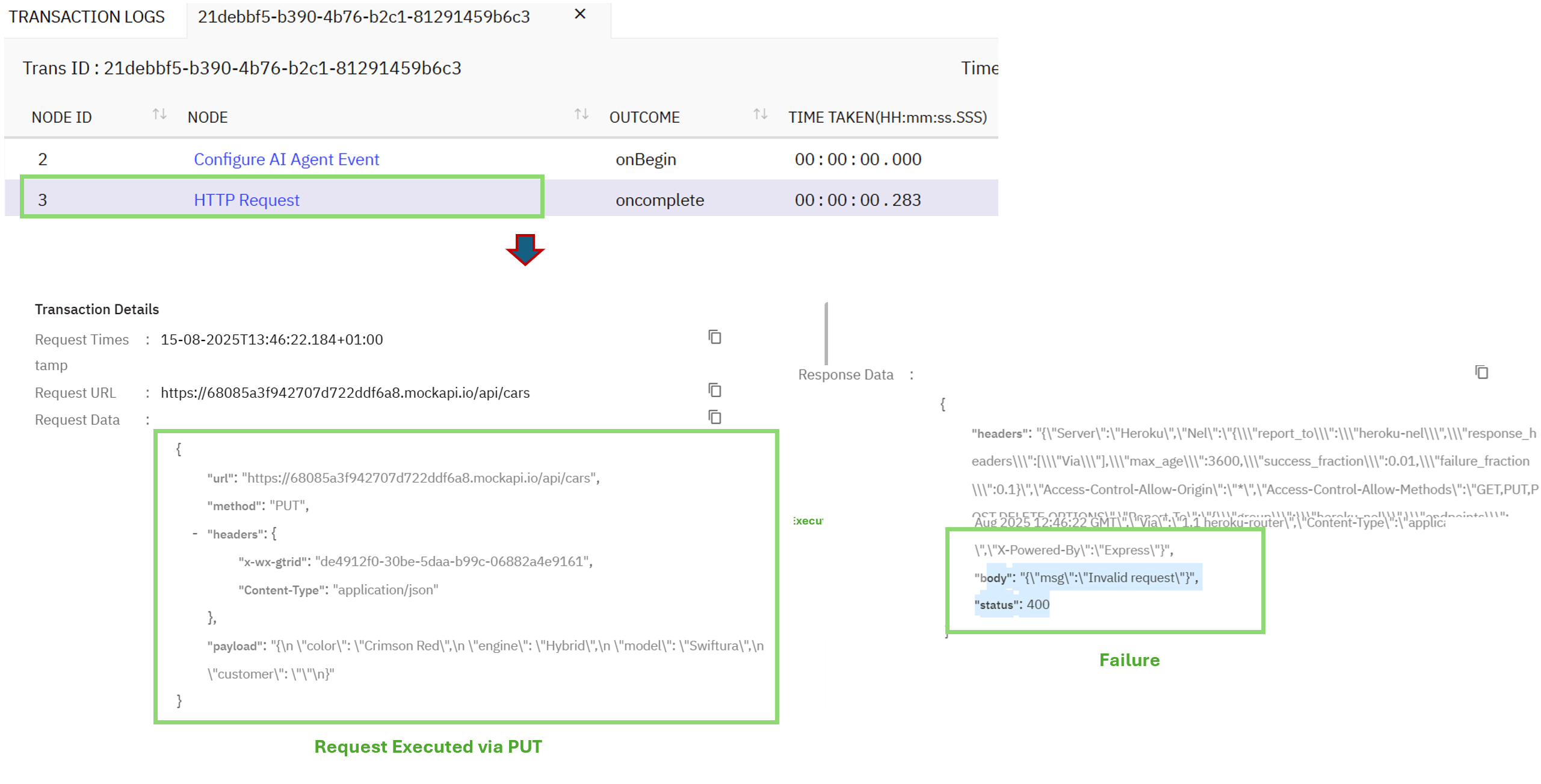 - In the HTTP Request Node, you'll see the request data was constructed and the API was executed. However, the response data shows a status of 400 Bad Request, indicating the request was not processed due to an invalid request.