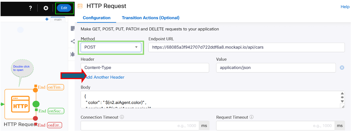 - Configure 'HTTP Request' node outcomes by dragging the orange, green, and red outcome dots to empty space on the canvas and selecting appropriate outcomes (e.g., 'onTimeout' - Error, 'onSuccess' - Success, 'onError' - Error).