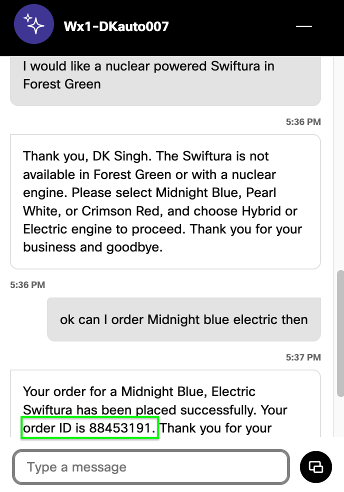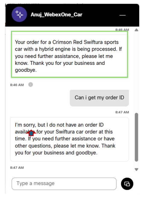 - Once it received all the necessary information, it successfully created the order and provided the order details.