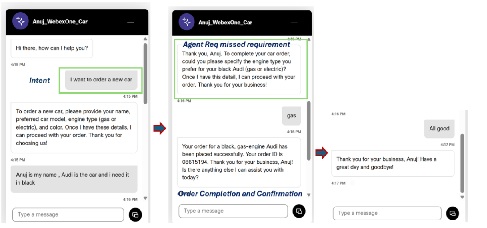 - As per its instructions, the AI agent requested car details like the model, engine type, and color.