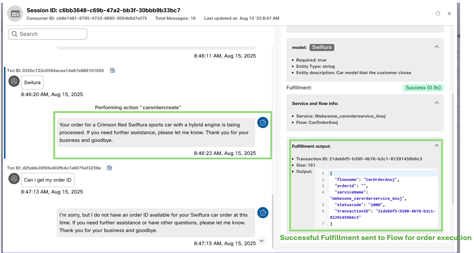 Note that the fulfillment was successful, and information was provided to the Connect Flow for order execution.