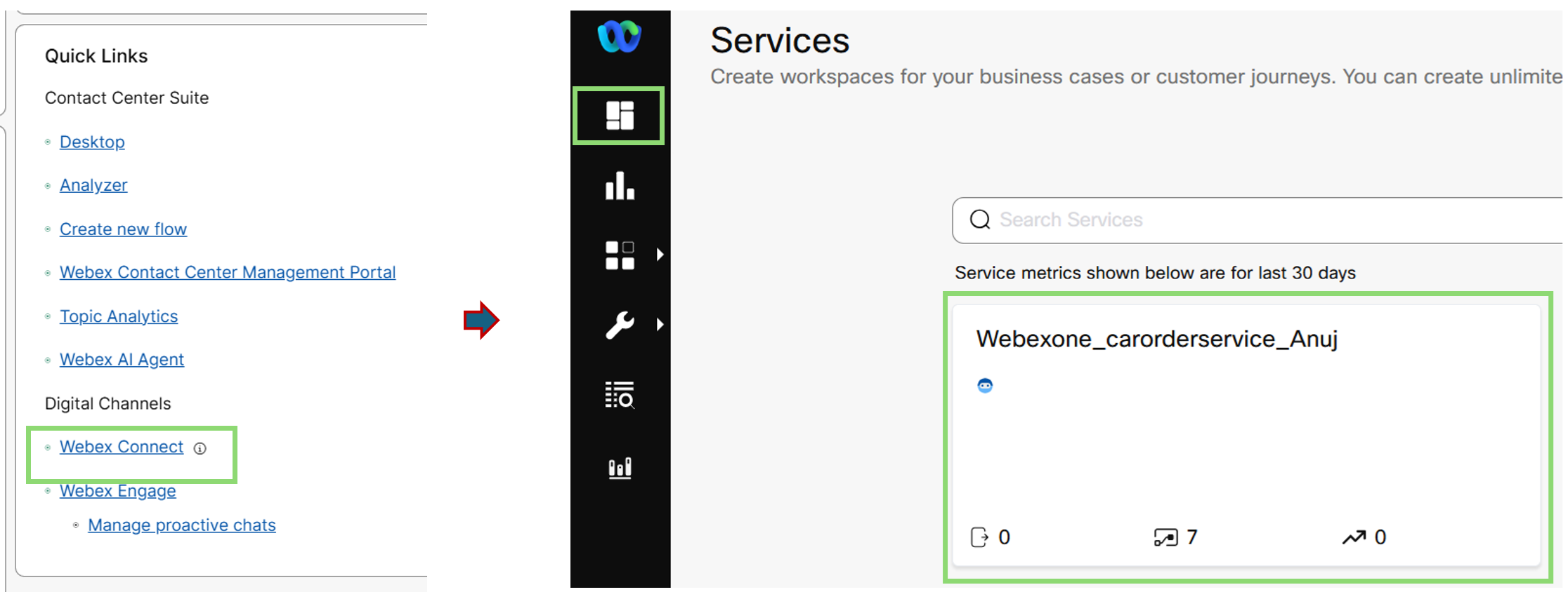 To access these, navigate to Control Hub > Contact Center Quick Links > Webex Connect, and then select the Connect service you created.