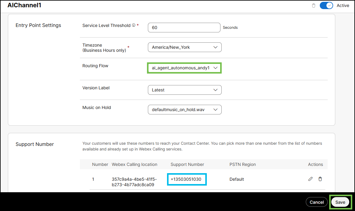 Open 'WebexOne_AI_EntryPoint_N' (_where 'N' is your lab user number), associate your created flow under 'Routing Flow' (note down the 'Support Number' associated with this channel - it will be needed later in this lab for testing), and click 'Save'.