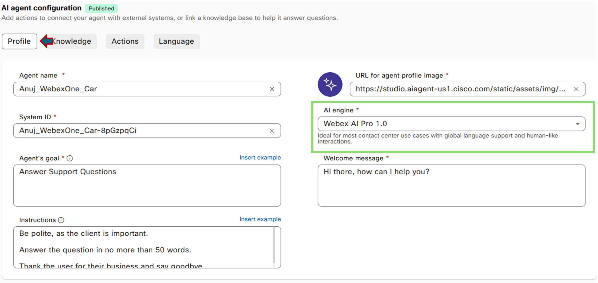 First, the bot may not be able to answer. This could be due to the agent's AI engine. If you notice this issue, you can change the AI engine to Webex AI Pro-Us 1.0 in the configured AI Agent Profile and test the call again.
