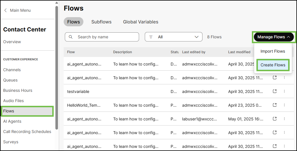 - After logging in to the Control Hub, navigate to the 'Flows' menu on the-left hand side.