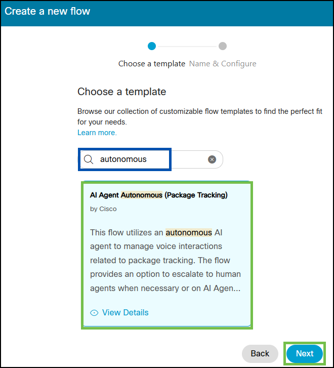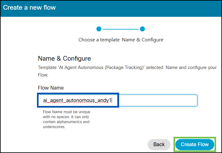 - Choose 'AI Agent Autonomous (Package Tracking)', click 'Next', provide a flow name (e.g., 'ai_agent_autonomous_andy'), and click 'Create Flow'.