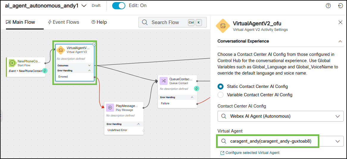 - Once the flow loads, click on the 'VirtualAgentV2' node and select the Webex AI Agent (created in Excercise 1) under 'Virtual Agent'.