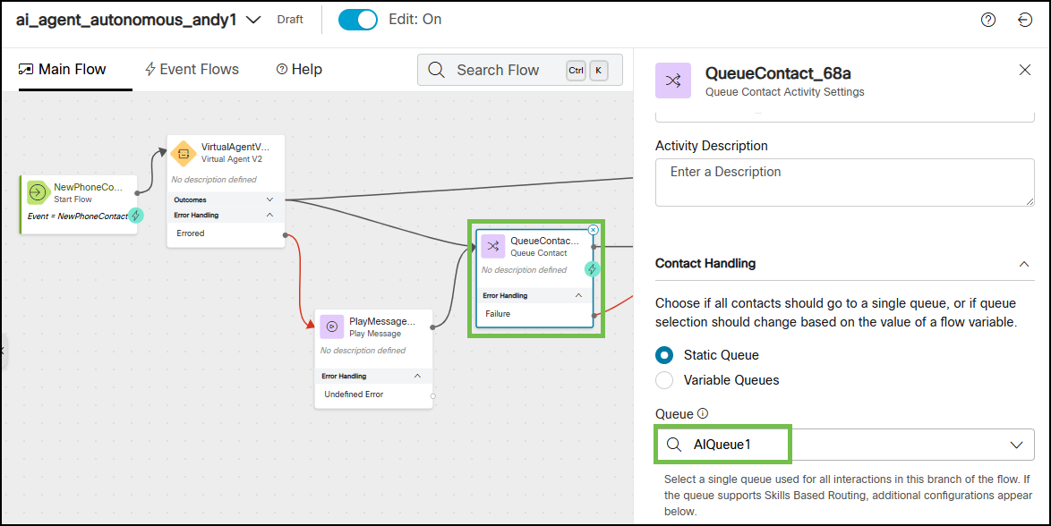 - Click on the 'QueueContact' node and select 'WebexOne_AIQueue_N' (where 'N' is your lab user number).