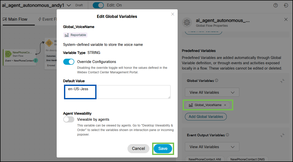 - Click on an empty space in the flow, then on the right-hand side, navigate to 'Global Variables'. Click on 'Global_VoiceName', select edit option (pencil icon), use 'en-US-Jess' for 'Default Value', and click 'Save'.