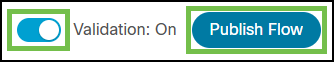 - Turn Flow Validation 'On' by clicking the 'Validation' button at the bottom of the page to publish the flow. Once validation is complete, click 'Publish Flow' and then 'Publish Flow' again in the next dialog box (Latest version label is selected automatically).