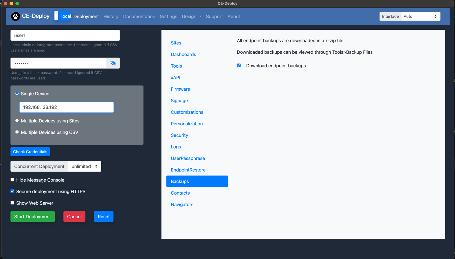 If you want a more configurable option the web admin portal of the device will allow customization of the device backup you can download from the device. CE-Deploy will only download an entire backup ignoring any options from the web admin portal.