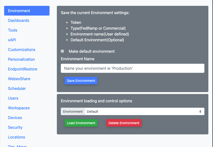 click Save Environment. The new environment is now saved, but the default will continue to be used unless you load