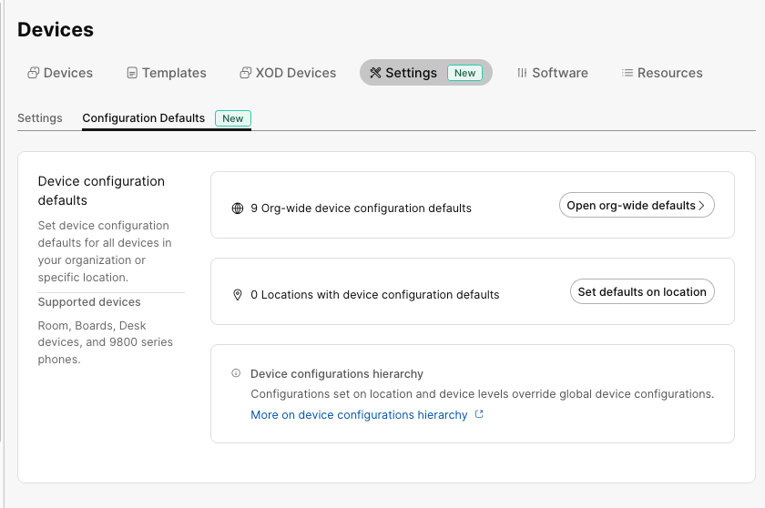 You can set configuration defaults for the whole organization, or for an individual location. These configurations are applied automatically to all devices that are enrolled in an organization, or set to a specific location. This helps you to manage configuration consistency across devices. When default configurations are applied, you can still configure an individual device or a set of devices if needed.