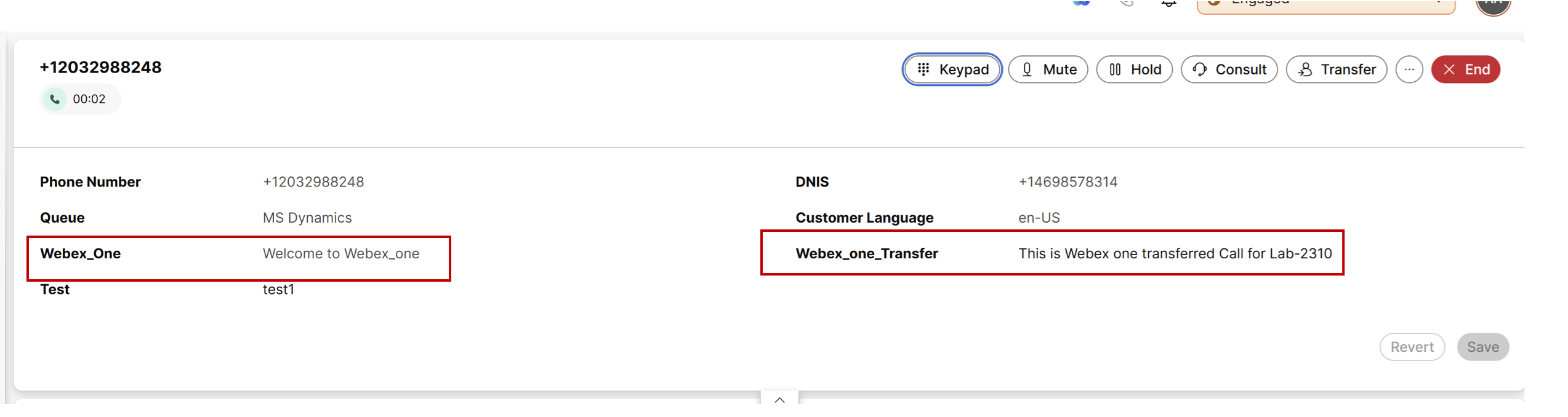 After the call is accepted, you should now see the two variables defined in the first flow on the agent desktop.