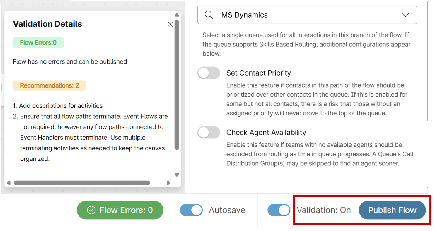 Toggle "Validation" to "On" to ensure there are no validation errors, and then publish the flow.
