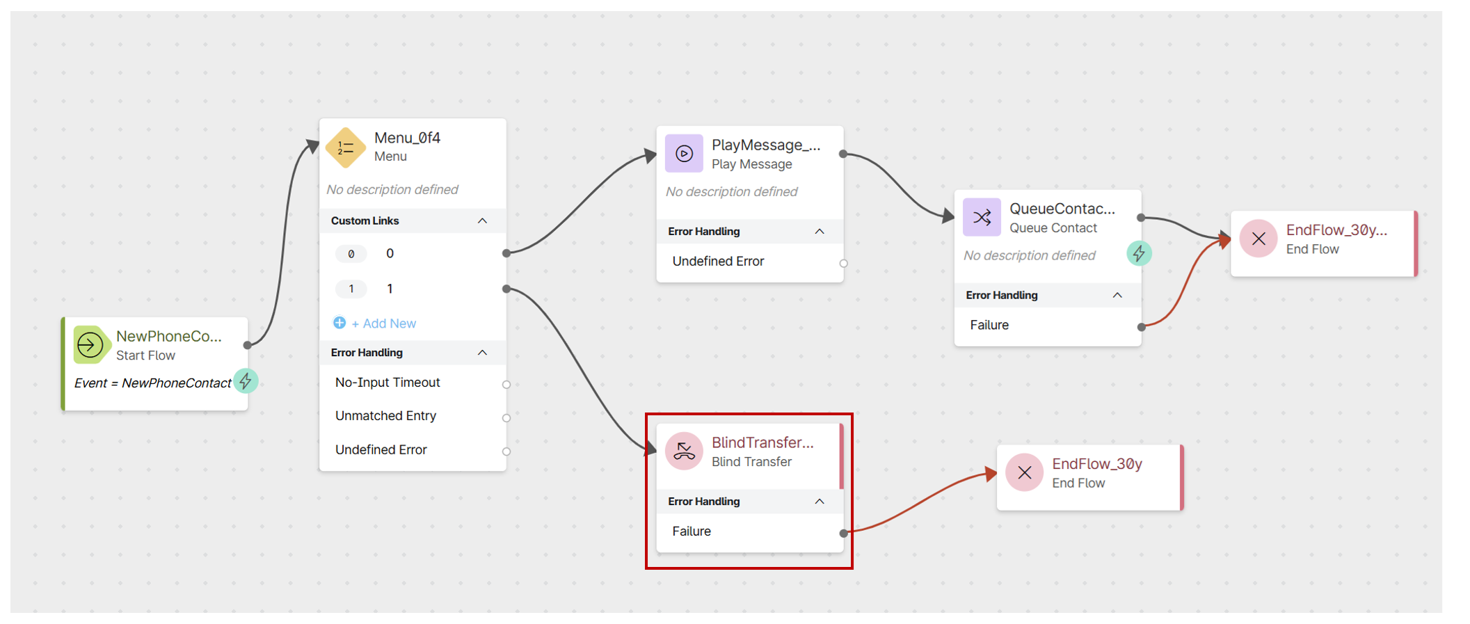 In the menu node for Option 1, you will notice that it maps to a "Blind Transfer" node.