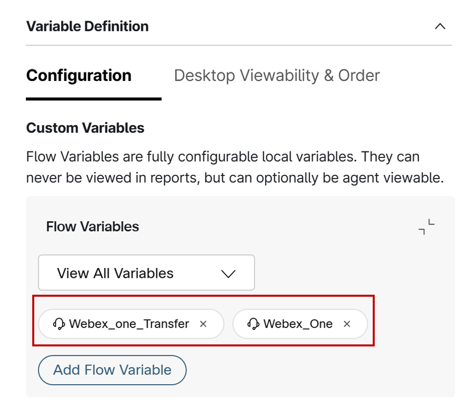 On the desktop, you should see two flow variables, "Wbex_one_Tansfer" and "Webex_one" However, you will notice that they are not appearing.