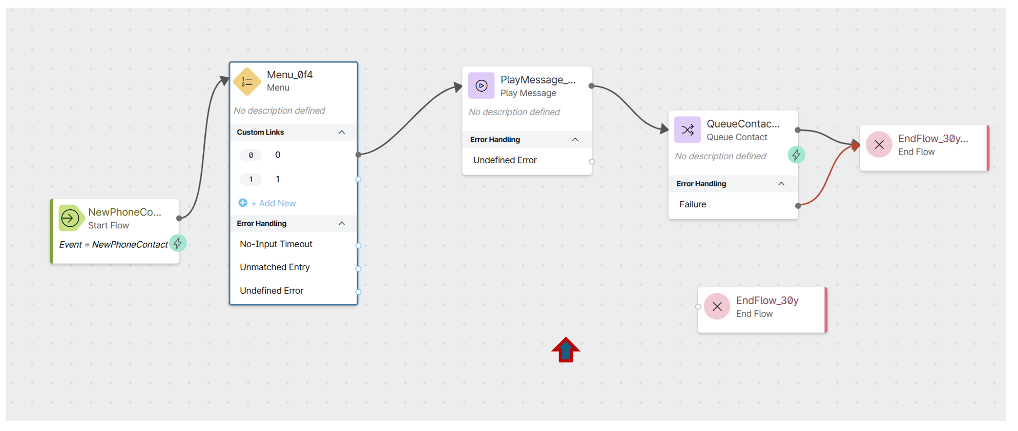 Connect the Menu node's Option 1 output to the GoTo Node and the "undefined" error output to the "End of the flow" node, as shown in the screenshot above