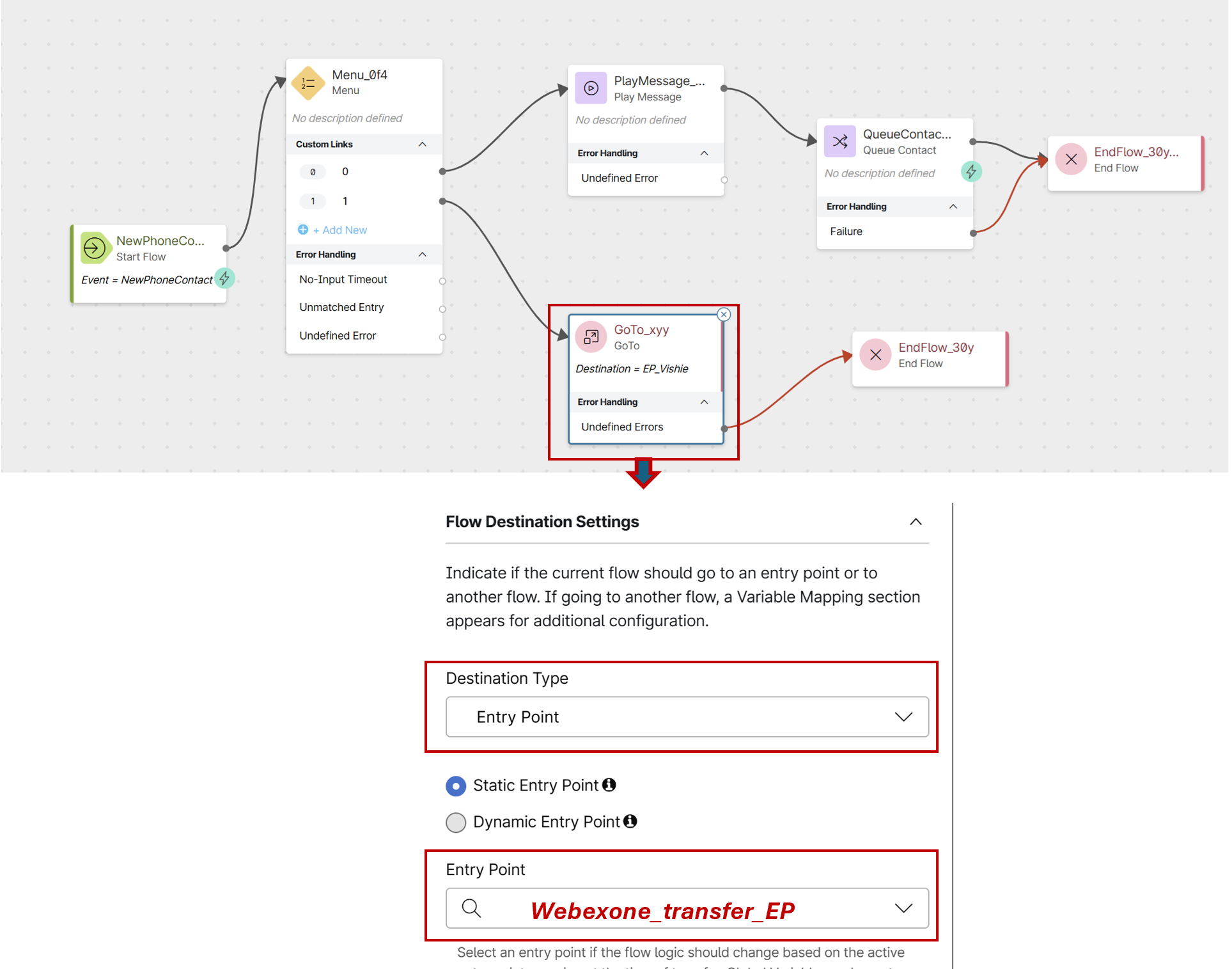 In the GoTo Node's properties, select "Entry point" as the destination type and map it to "WebexOne_Transfer_EP"