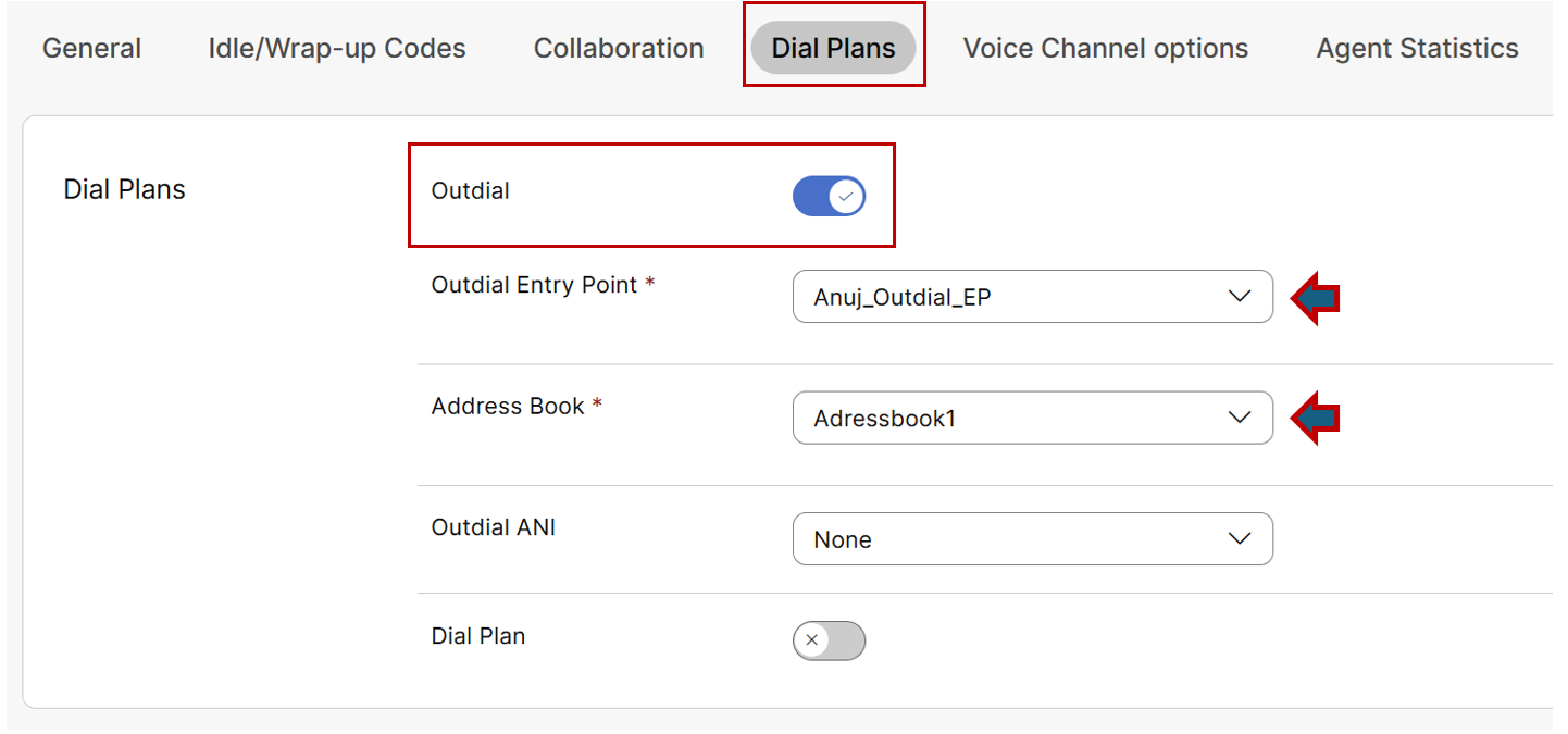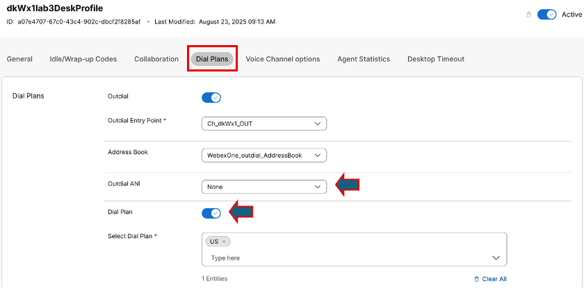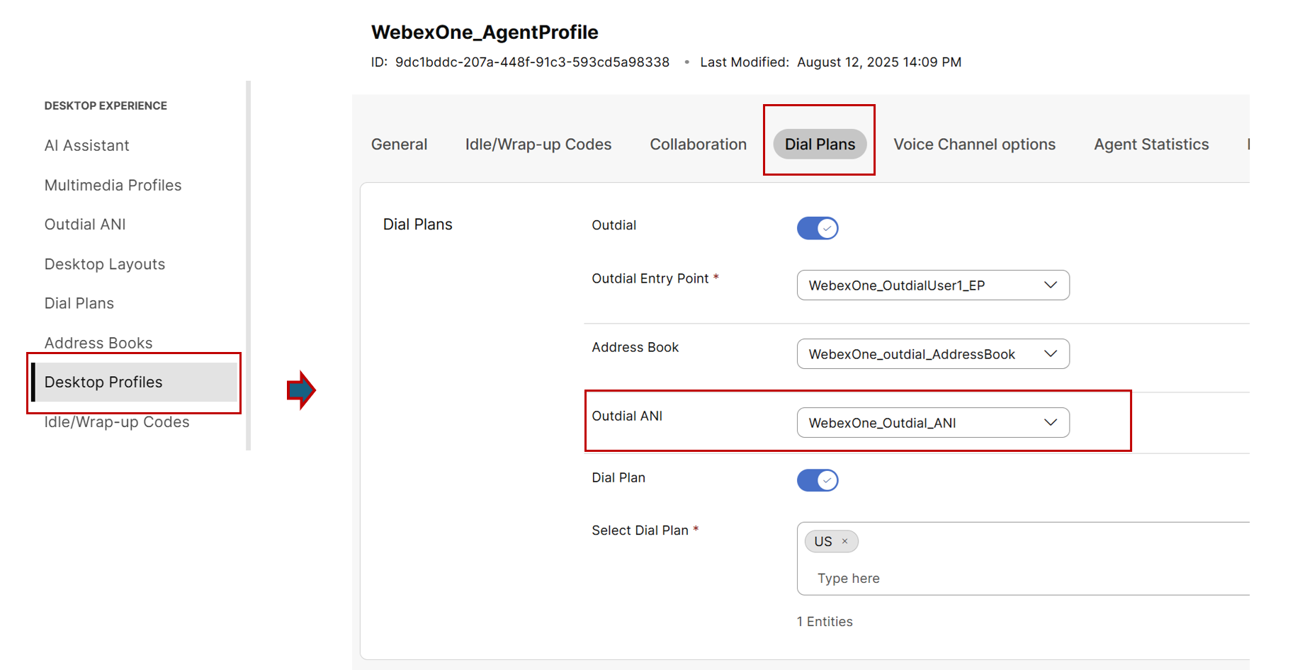 Since this is an agent desktop function, we'll check the agent's desktop profile and the dial plan where we enabled the outdial option.
