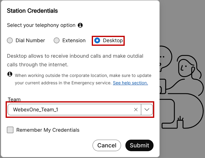 Please select desktop as telephony option and set the Team as WebexOne_Team_[num] and login.