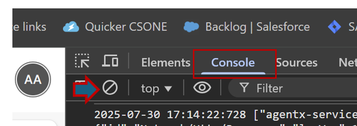 Once the developer tool is up, ensure that it's on the "Console" tab and clear the console logs by selecting the "Clear Console" button