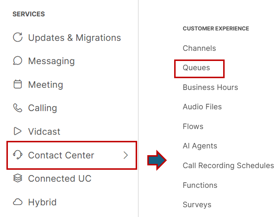 In the Contact Center navigation pane, under Customer Experience, select Queues.