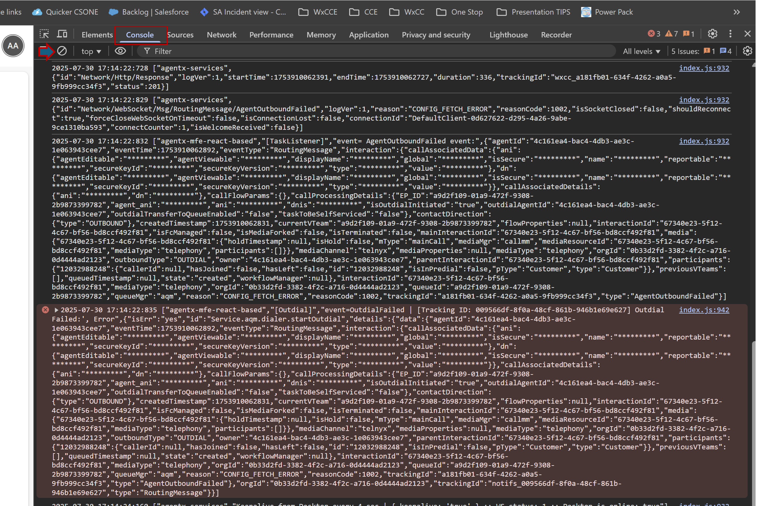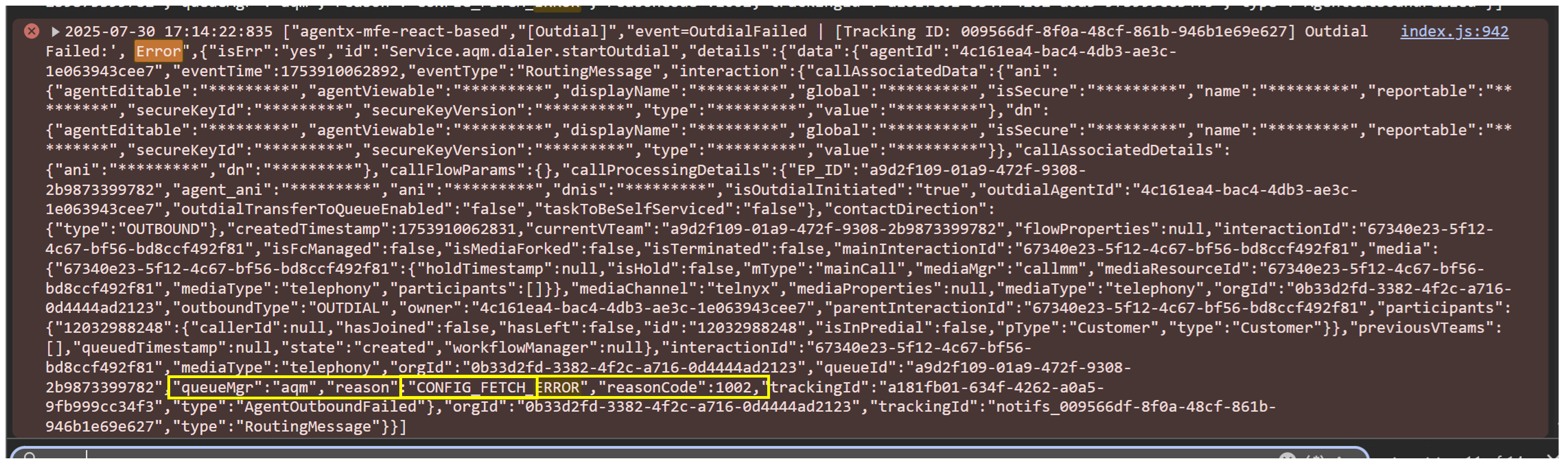 As soon as the call fails, you should see a red error message in the console logs with the message event=OutdialFailed
