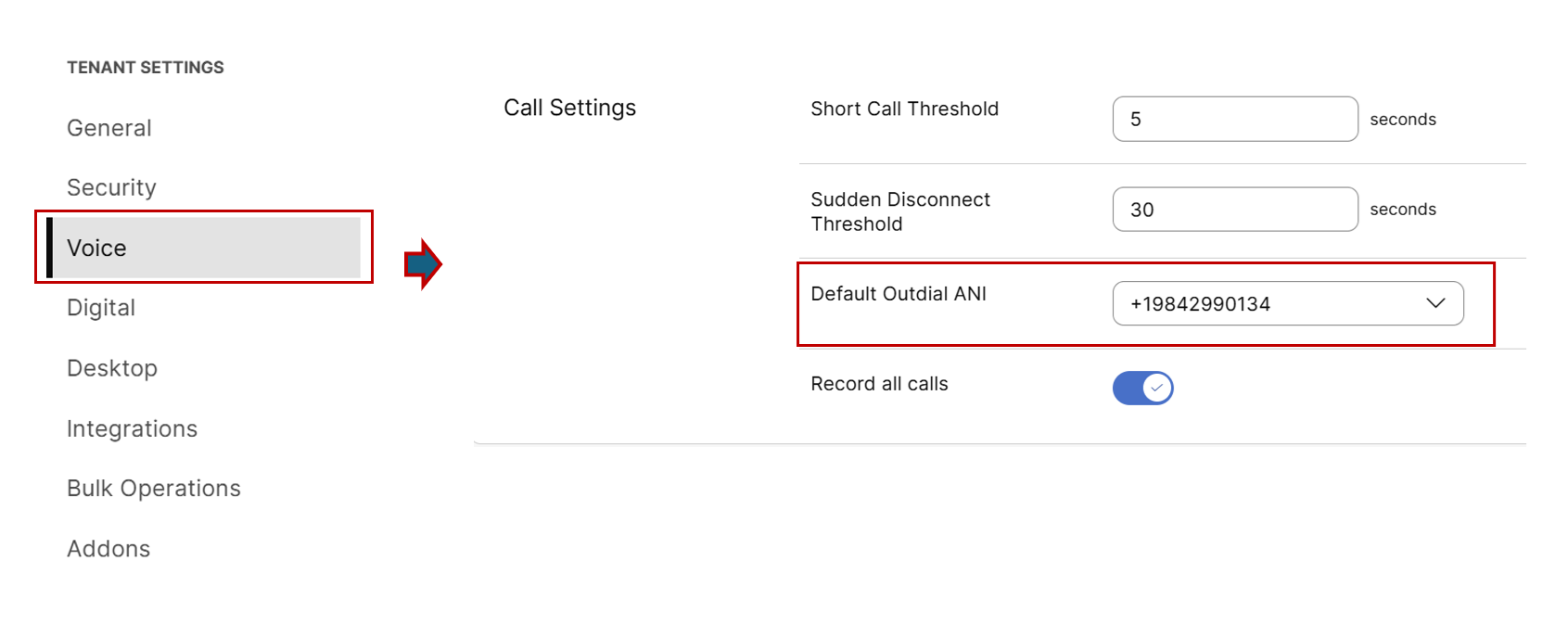 To, review the Tenant-Level Outdial ANI setting in tenant Settings navigate to the Voice tab and note the existing Outdial ANI which is "+19842906065".