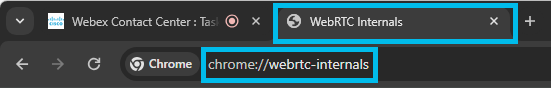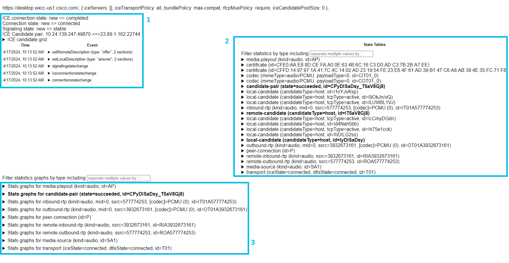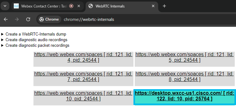 - In the WebRTC-internals tab select the active WebRTC session part (desktop.wxcc-us1.cisco.com in its name).