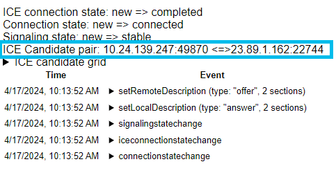 - Local and remote IPs and ports in use for this particular WebRTC connection can be seen under traces of the PeerConnection API calls.