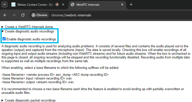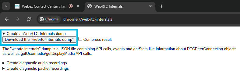- WebRTC log dump can be retrieved by clicking 'Create a WebRTC-Internals dump' and clicking 'Download the "webrtc-internals dump" option.