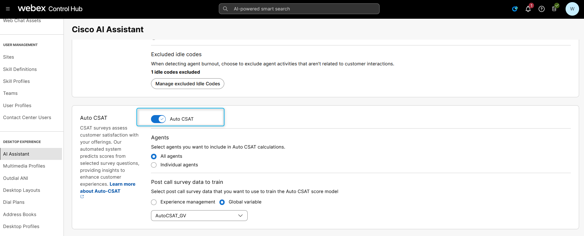 You can enable or disable the AutoCSAT feature directly from the Control Hub.