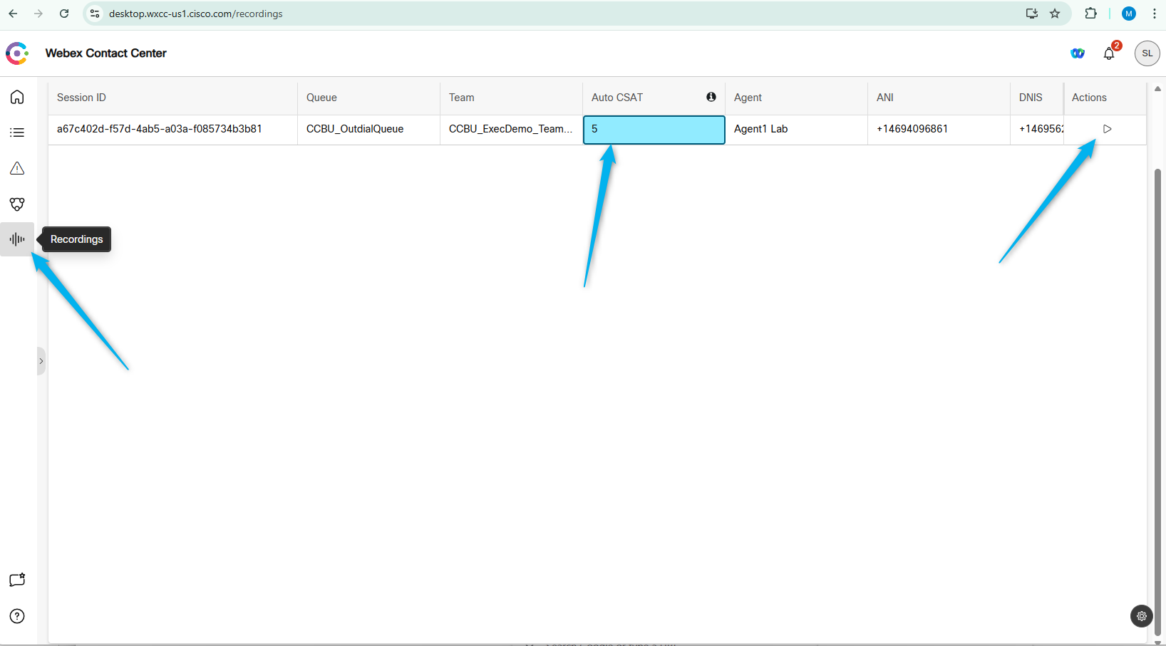 [READ ONLY] When you log in to the Supervisor Dashboard, you can view the AutoCSAT score for specific calls and listen to the call recordings directly from the supervisor desktop. (The Supervisor user account is not configured for this lab. Please refer to the screenshot below to understand the experience of viewing the AutoCSAT from the Supervisor desktop.)