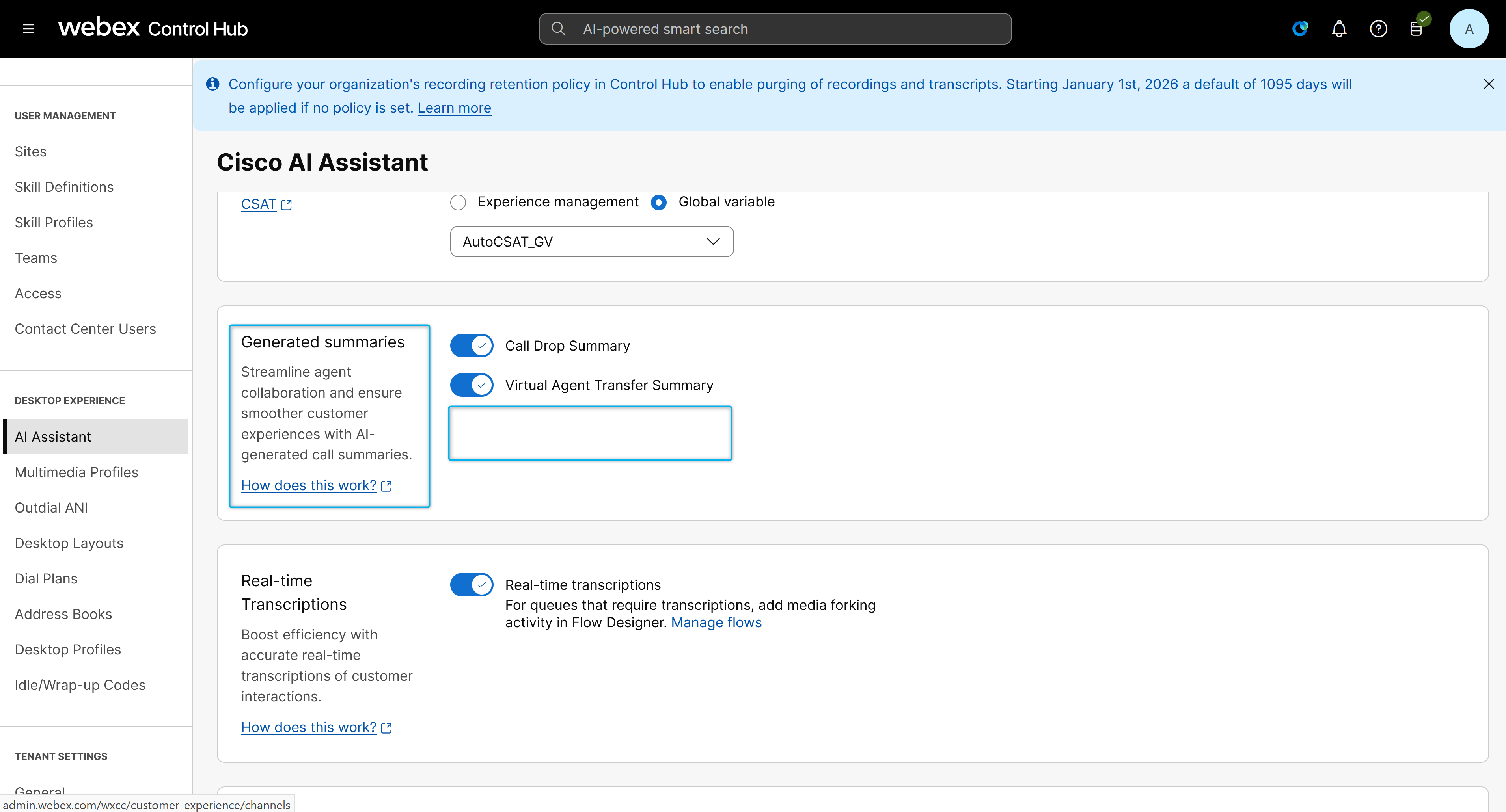 Currently, Wrap-up Summary is not even in early access, so you will not be able to see its enablement in the Control Hub. However, once the feature is in General Access, you will see the toggle under the General Summaries section.
