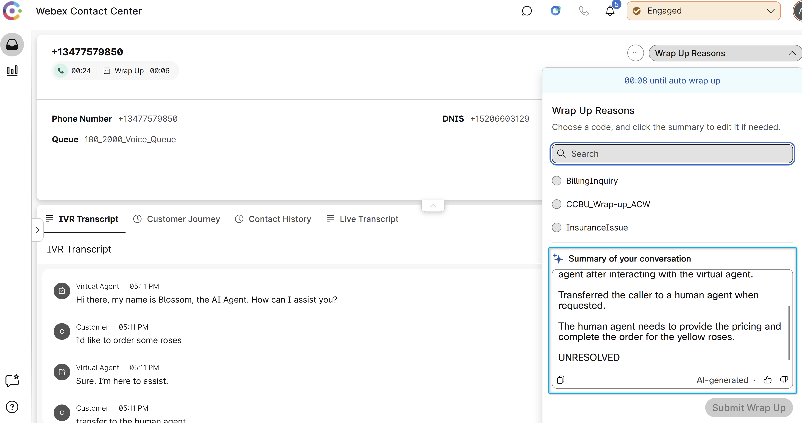 Place a call to your channel. While connecting to the AI Agent, request a transfer to a human agent. Answer the call on the alpha Agent Desktop and engage in small talk about flower ordering. After disconnecting the call, the Wrap Up Summary window should appear, displaying a summary of the call between the caller and the agent.