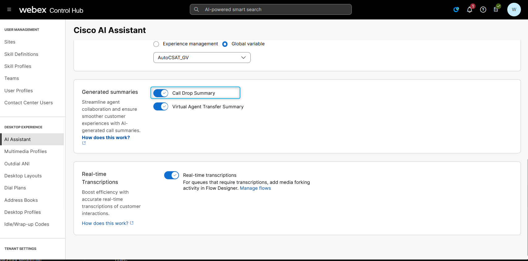 Once you purchase the offer, admins with the appropriate profile and access controls will be able to see the AI Assistant menu in Control Hub. Post purchasing the offer, the customer can enable/disable the Call Drop Summary features from the Control Hub.