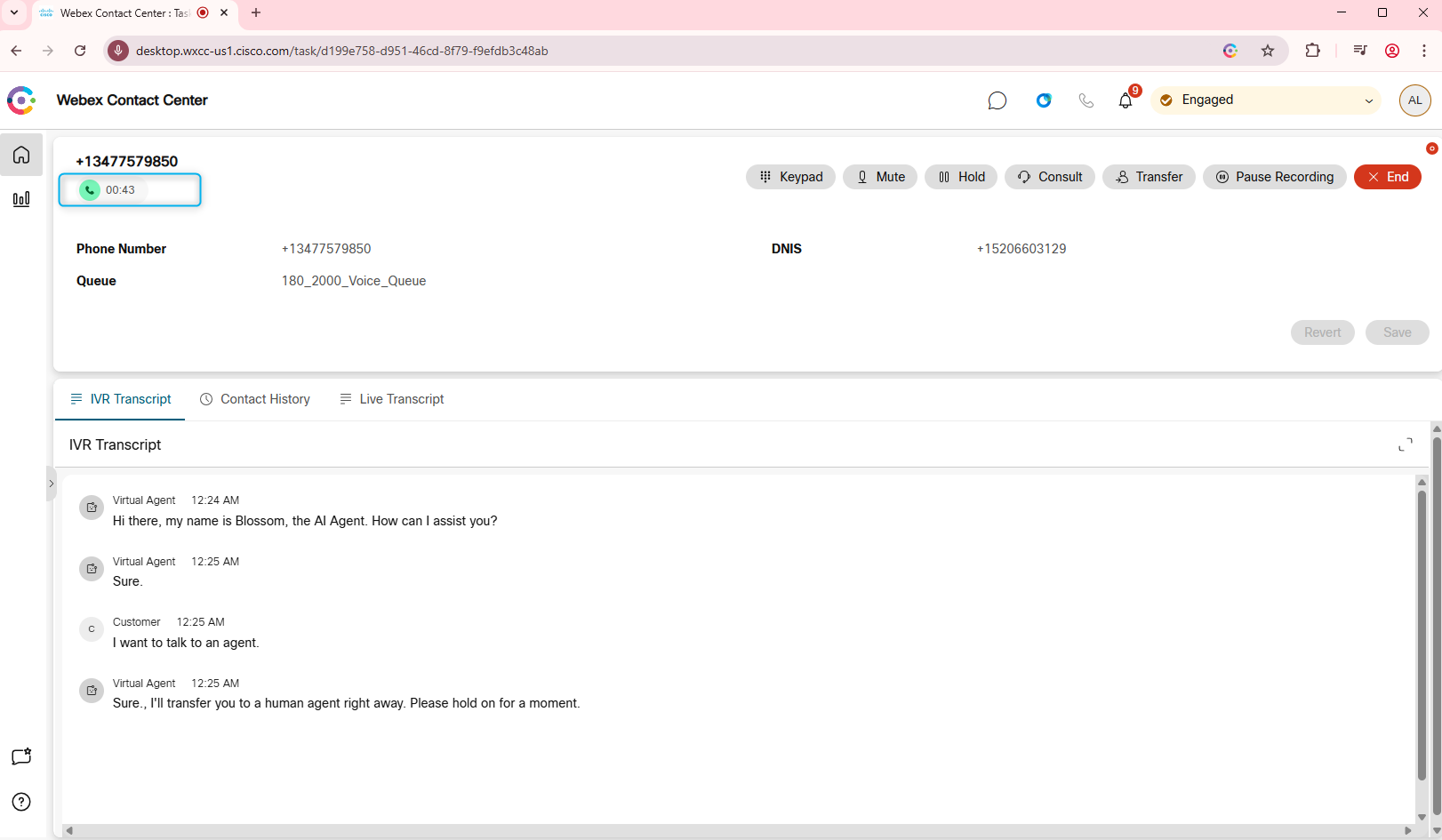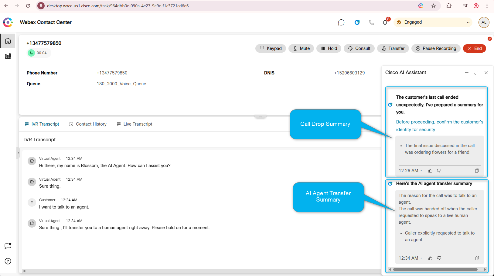 Become Available on the Agent Desktop and answer the call. You will see AI Assistant Widget will have Call Drop Summary and the Agent Transfer Summary.