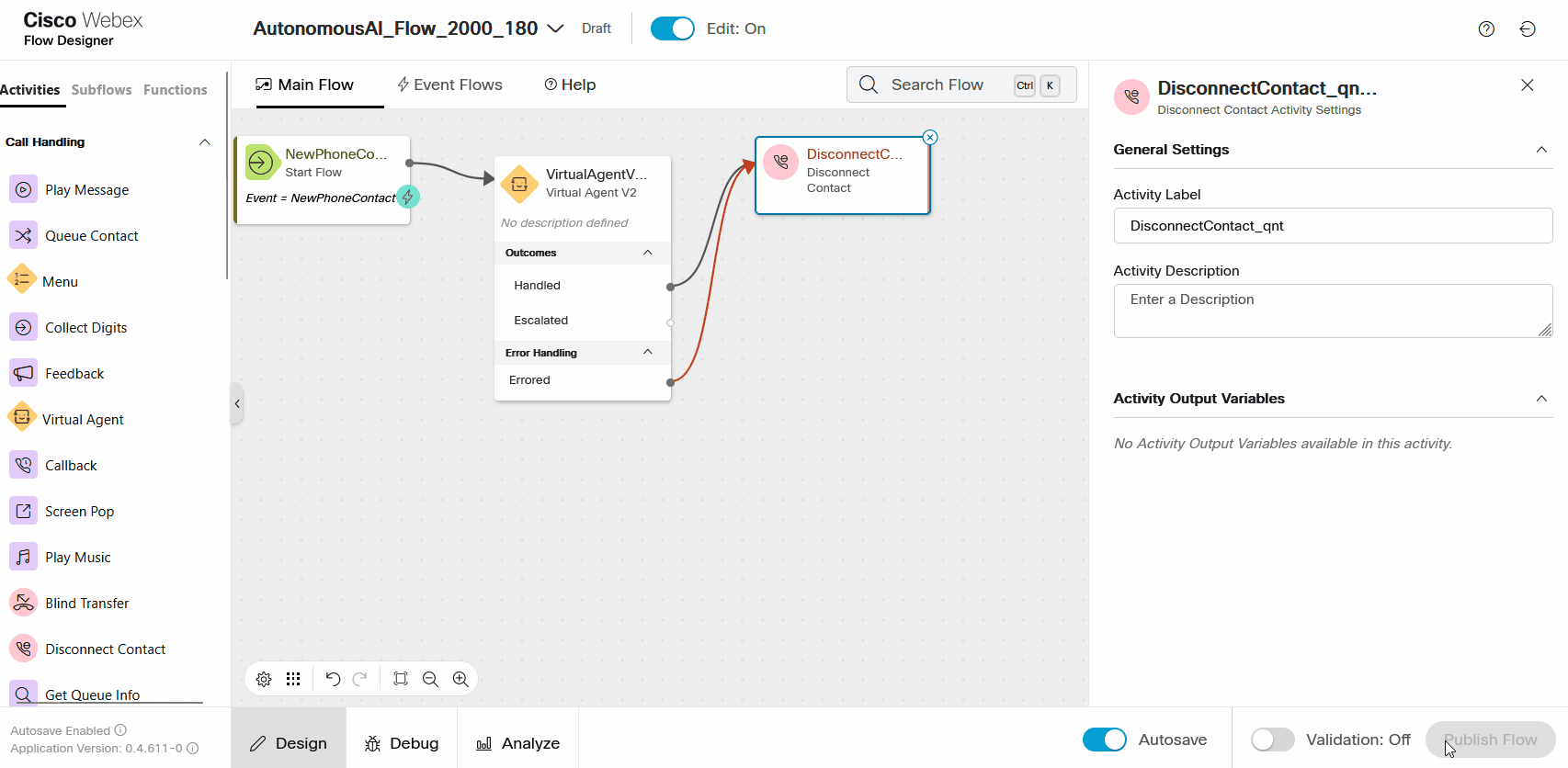 Make sure the Edit mode at the top is set to ON. Then, drag and drop the Virtual Agent V2 and DisconnectContact activities from the left panel onto the canvas.