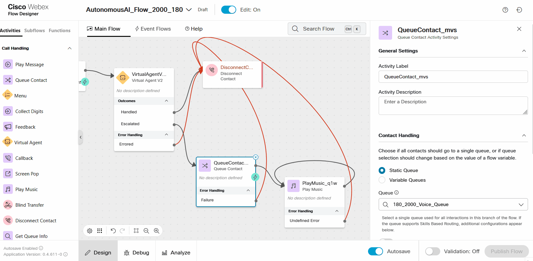 Connect the Failure path from the Queue Contact activity to the Disconnect Contact activity.