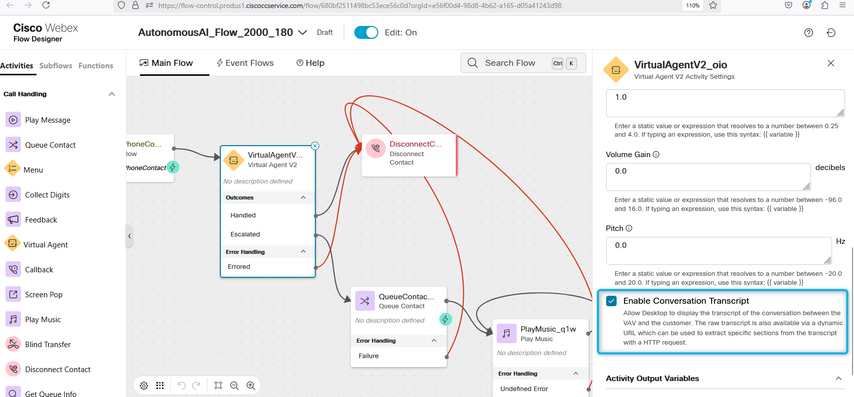By default, the Conversation Transcripts setting is enabled in VirtualAgentV2 block.