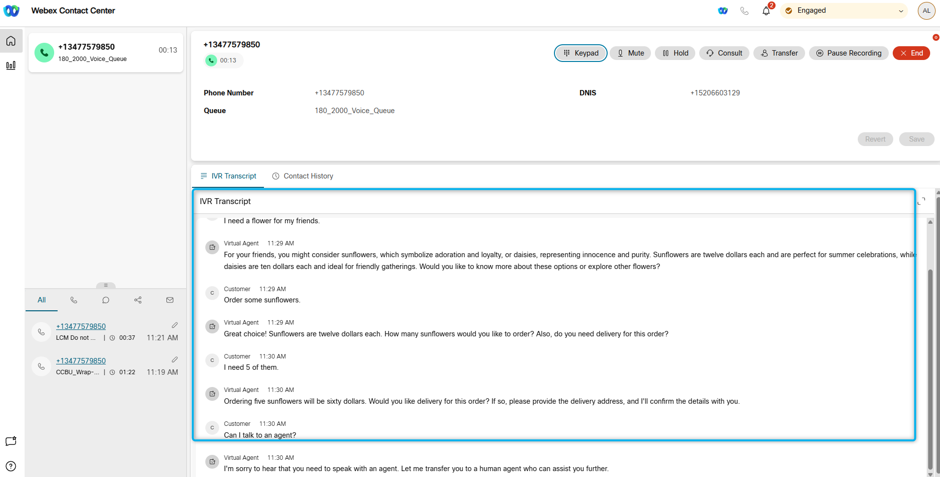 With this setting enabled, the live agent can see the conversation details between the caller and the AI agent. Please check if you can view the IVR transcripts during your test calls with Agent Handoff.