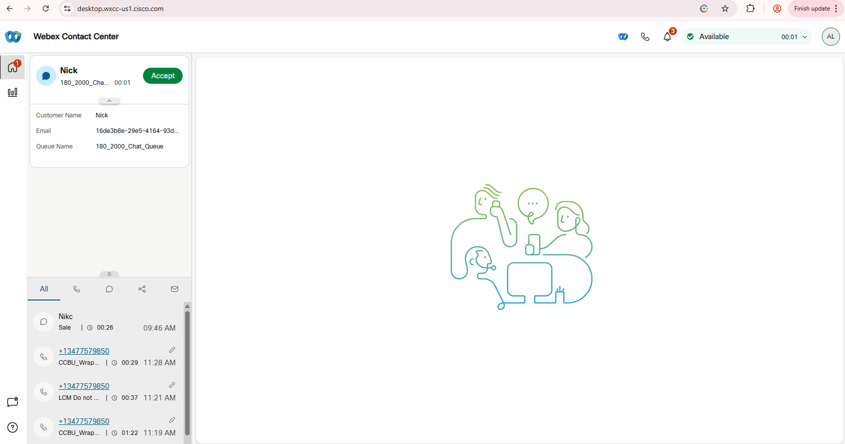 Login to Agent Desktop with your agent credentials to receive the test chat. You should see the transcripts with details of what the customer was discussing with the AI Agent before the conversation was handed off to the live agent.