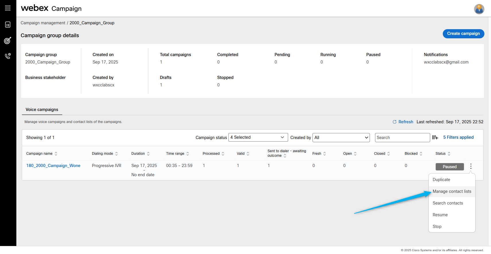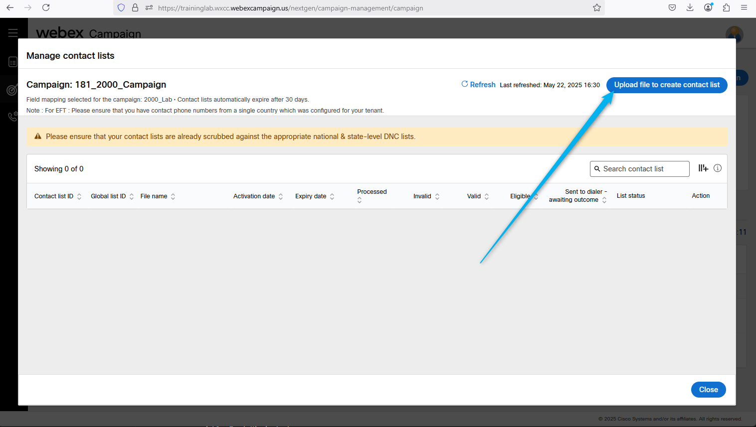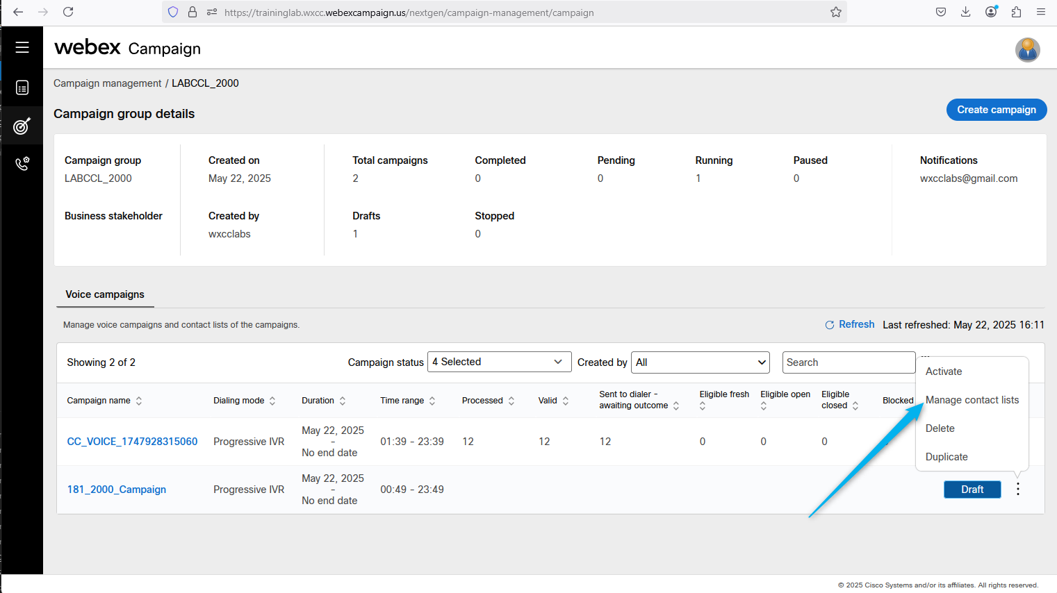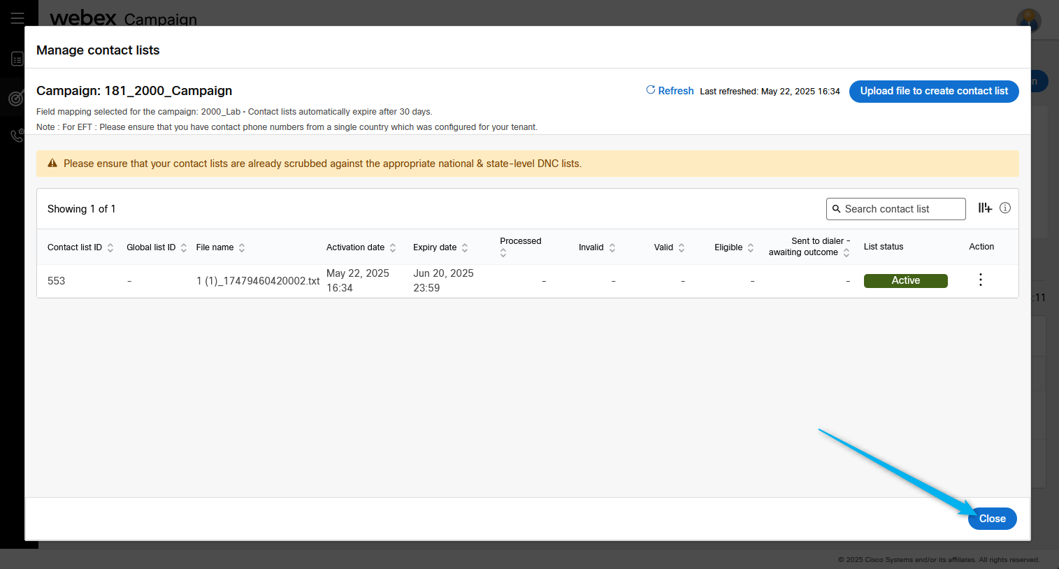 Go back to Webex Campaign Manger, find your campaign and click on Manage contact lists.